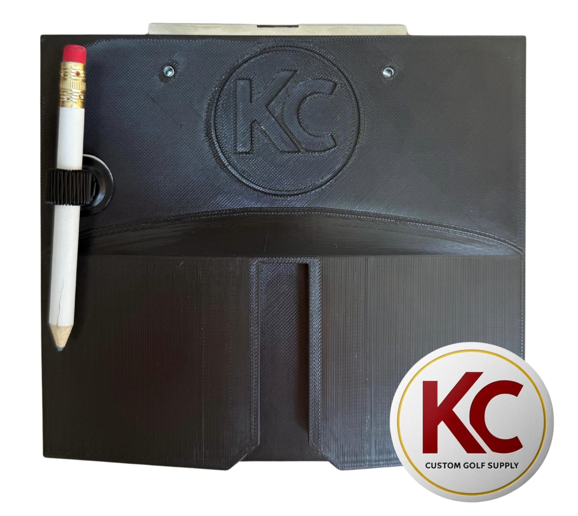 Check out this clipboard with included mount that'll solve all of your scorecard woes. No modifications required - just zip it on and you're all set.